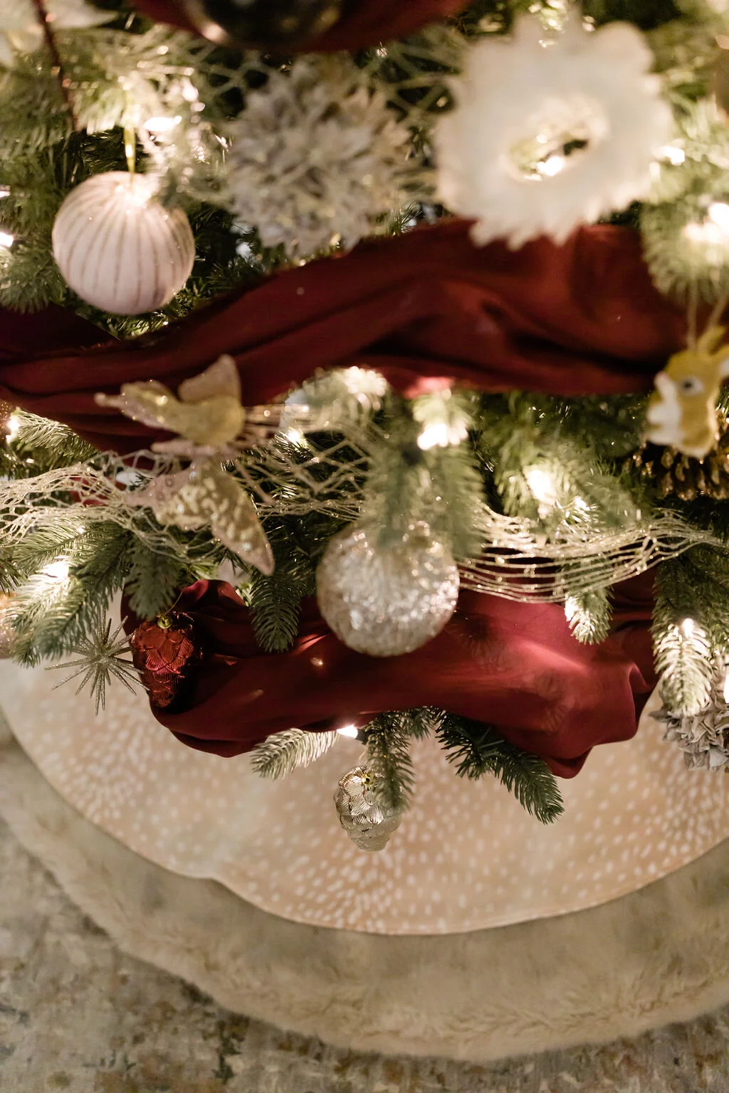 To be mindful of our consumption and waste, I reused gold ribbon and a few ornaments from previous years. The main new addition is a beautiful fabric I found at a local fabric store—in the Mulberry I saw pop up all over the city, of course. A box of new ornaments finished this year’s tree off. One day there’ll be enough stockpiled in the collection that we won’t have to buy any more decorations—we can just mix and match in different combinations for an always fresh vibe.